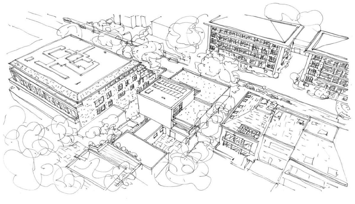 In extending the building, we were obliged to create a light-weight structure that could be supported by the existing building. The museum had been specially designed to contain some very special items. With walls in textured concrete, as if emerging from the ground, it allows very little light to penetrate in order to protect the books in the collection. We wanted to create a box that would be set back in order to magnify this stone-like base on which it would stand, but which would be open to the outside. It is designed as if the box has been slid apart to reveal its contents to the public, in the process creating courtyard terraces for the director’s apartment and office spaces. This openness is also seen through a large window visible from the road that enables the public to see the documents and research materials. These are displayed on rotating bookcases that give a sense of the interior turning towards the exterior. An invitation to come and go, just as the binding is an invitation to enter the book. An invitation to researchers and students, displaying the catalogues is an invitation to enter the building to study.