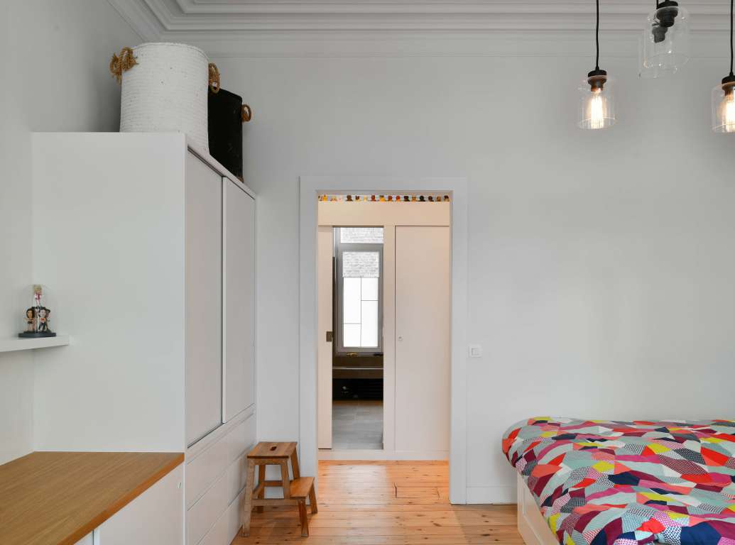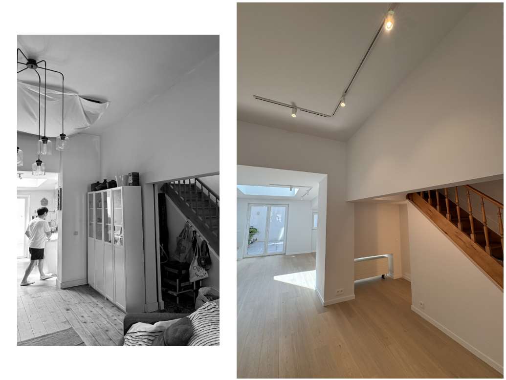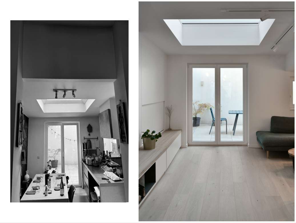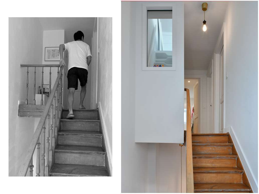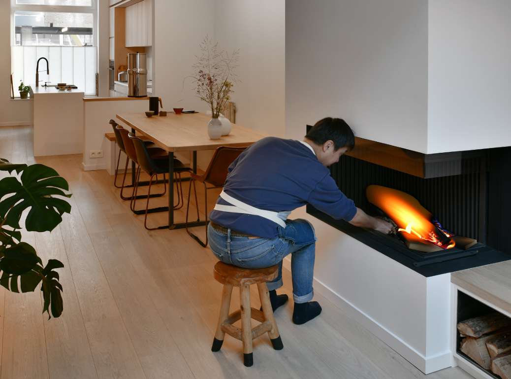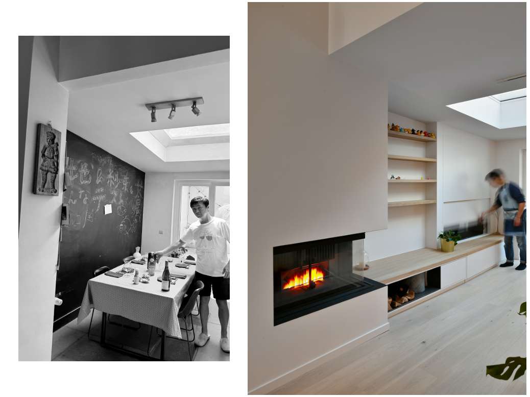 At the heart of the project, the kitchen — both a family and professional laboratory — has moved. Once tucked away at the back, it now sits at the entrance, facing north, on the street front. There, it opens to the light reflected by the glazed façade of the neighboring office building, which plays with the sun’s rays like an unexpected accomplice. Between the front door and the staircase leading to the bedrooms, this threshold becomes the true hearth of the home: a place to gather, eat, talk, and create. The living room, meanwhile, calms down. A space for decantation, it welcomes the chef after the rush of evening service. In front of the open fire, the flames become meditation — breathing space, a passage between two worlds. Every square meter of this narrow house is treated with the precision of a boat. The staircase, which once ended at the second floor, now continues with a miller's stair — compact and daring — leading to the attic: a wooden cocoon, crafted to the millimeter, where one can store, study, or sleep under the stars. In its modesty, the KAMO project embodies a gentle yet determined transition. It expresses a new way of inhabiting the city: reconciling Brussels’ density with the breath of nature, transforming without erasing, inventing without imposing. Like a well-balanced recipe, this house breathes, adapts, and harmonizes — a subtle equilibrium between energy, matter, and humanity.