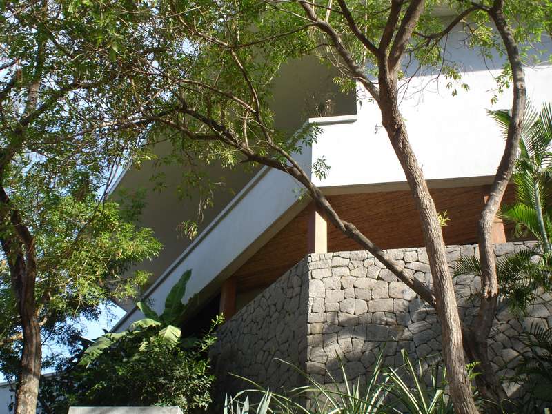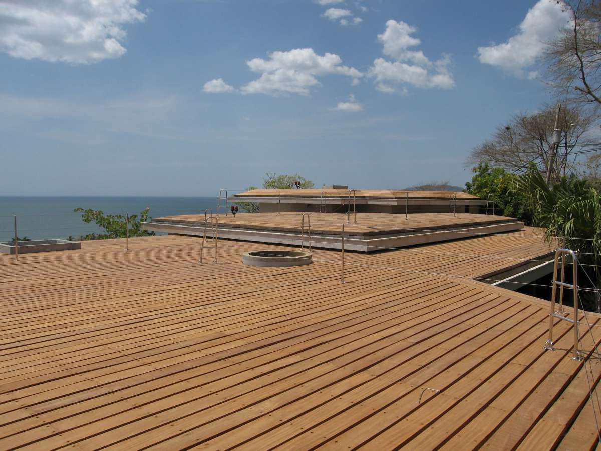 Belgium holds a unique place in her heart. It’s not just the people. Not even the Nordic-esque weather. Maybe it’s the distinct, but inclusive culture. Unlike him, she dislikes the heat, hates humidity, wilts when there’s too much sun and an influx of insects; all of which are omnipresent in Tamarindo. He is an accomplished surfer, used to travelling in remote tropical countries in search of the perfect break. She, on the other hand, prefers to read a book in an antiseptic environment; he is on a constant quest for adventure, for experiences that will stimulate his adrenaline. He loves nature. The house is located on a steep hill overlooking the city of Tamarindo, sat atop a plateau of 5 acres. The glistening Pacific twinkles below, just 15 minutes on foot. The Guard house and the Cook studio are carved into the hill side. The leftover earth was recycled to raise the garden level to the height of the terraces. The plateau intended for the building welcome the garden as all the constructions surround it at different levels following the contour lines of the site and cantilevering out over the cliff. The main living spaces are totally open plan, offering a view from the backyard on to the swimming pool that segues seamlessly with the ocean view. These open living spaces (that can be closed with concealed sliding windows) are in the middle of the two pillars of the house. The first internal pillar is the garden as an inner courtyard, bringing a freshness and intimacy to the whole project. The second one, this time external, is the pool terrace, allowing the experience of being at one with the sun, the sea, the sand and the salty pura vida air. These two distinct spaces are connected by large covered walkways giving shelter from sun and rain, abstracting the limits between the interior and the exterior. These circulation spaces bring us through the space along the walkway, travelling via the living spaces, to the bedrooms with their bathrooms open to the sky, and finally to the massage gazebo and its gigantic deck roof terraces where we drift and dream along the sunset.
