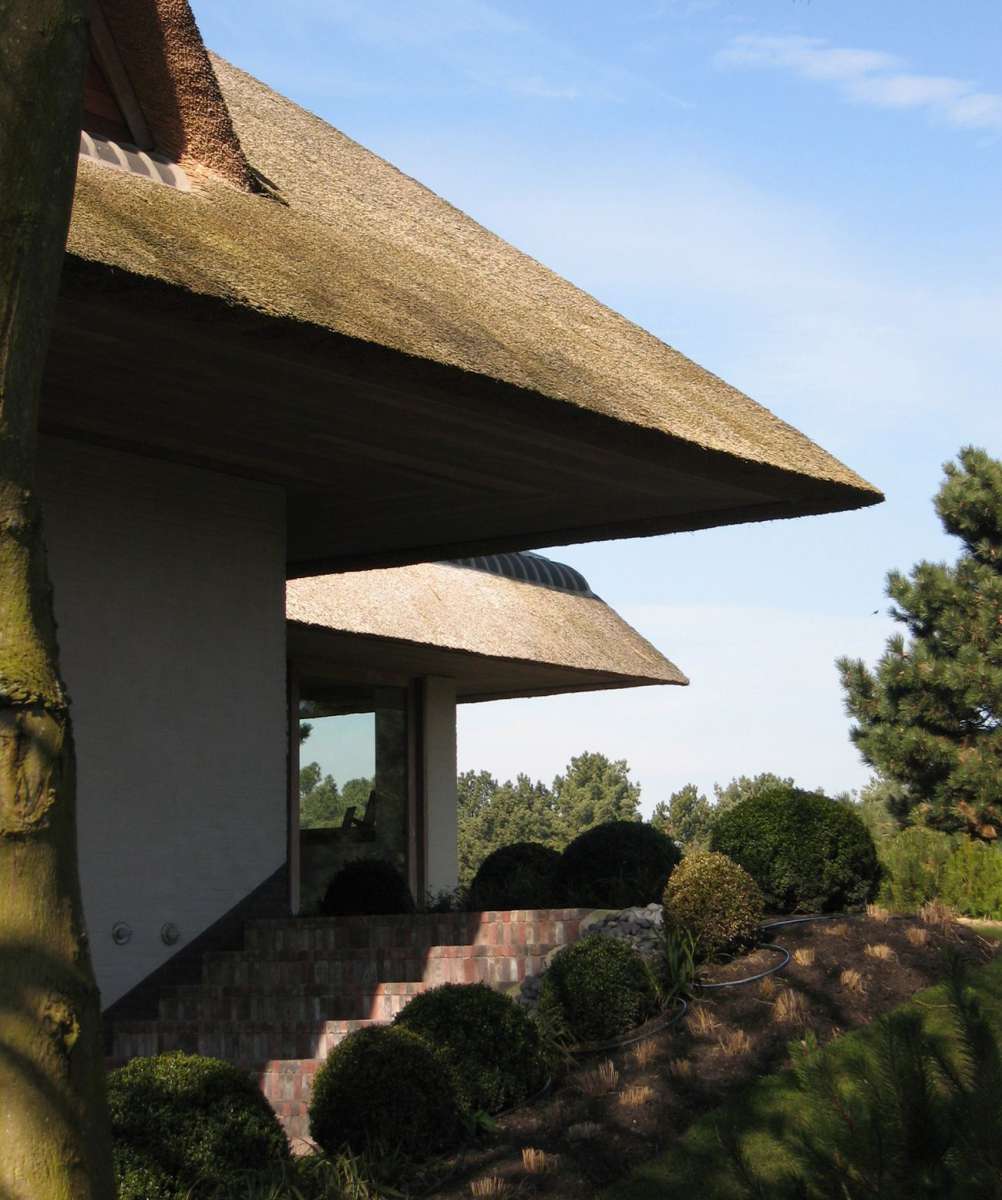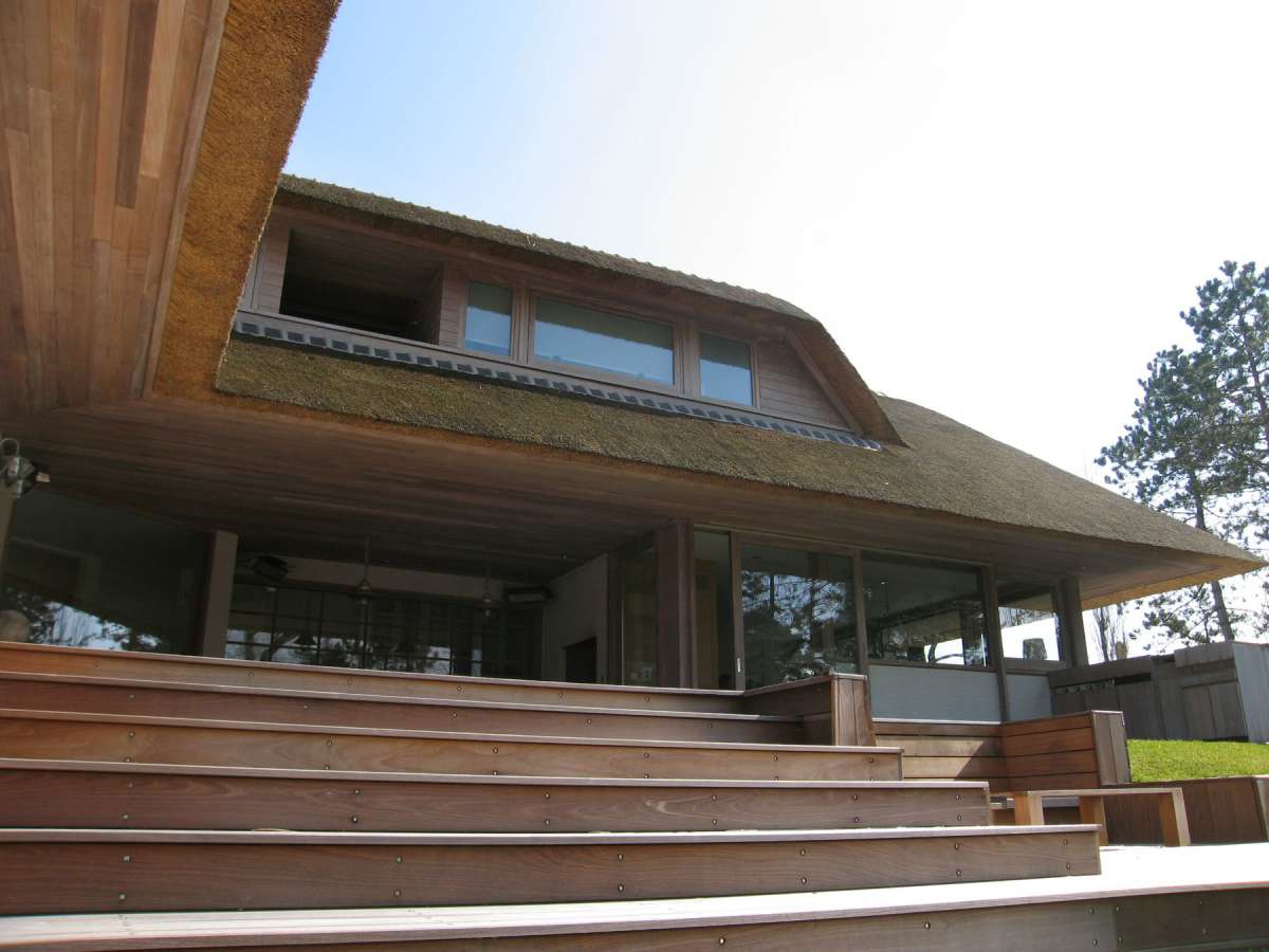 The villa is located alongside a golf course. While e had to meet stringent planning conditions and stick to a tight schedule, we were keen to integrate the villa into the landscape as much as possible and to preserve the natural views of this special environment. Our client had the intention to fitting and maximizing the project within the strict limits on volume that were permitted. This led us to develop a design that would make the most of the varied heights of the surrounding dunes, concealing the building among their multiple and complex slopes. Thatch is a natural material typical of the region that is also widely used in many parts of the world. Its malleability enabled us to create a unique style that blends perfectly with our northern maritime environment while bringing an aesthetic that is close to the large covered terraces and overhanging roofs found in architectural styles associated with the Far East. This surprising approach unexpectedly connected with our clients’ dreams, who love Bali but did not dare dream of bringing it to the Belgian Coast. This unstated dual identity gives the owners the feeling of being simultaneously at home and elsewhere, giving the building a timeless quality.