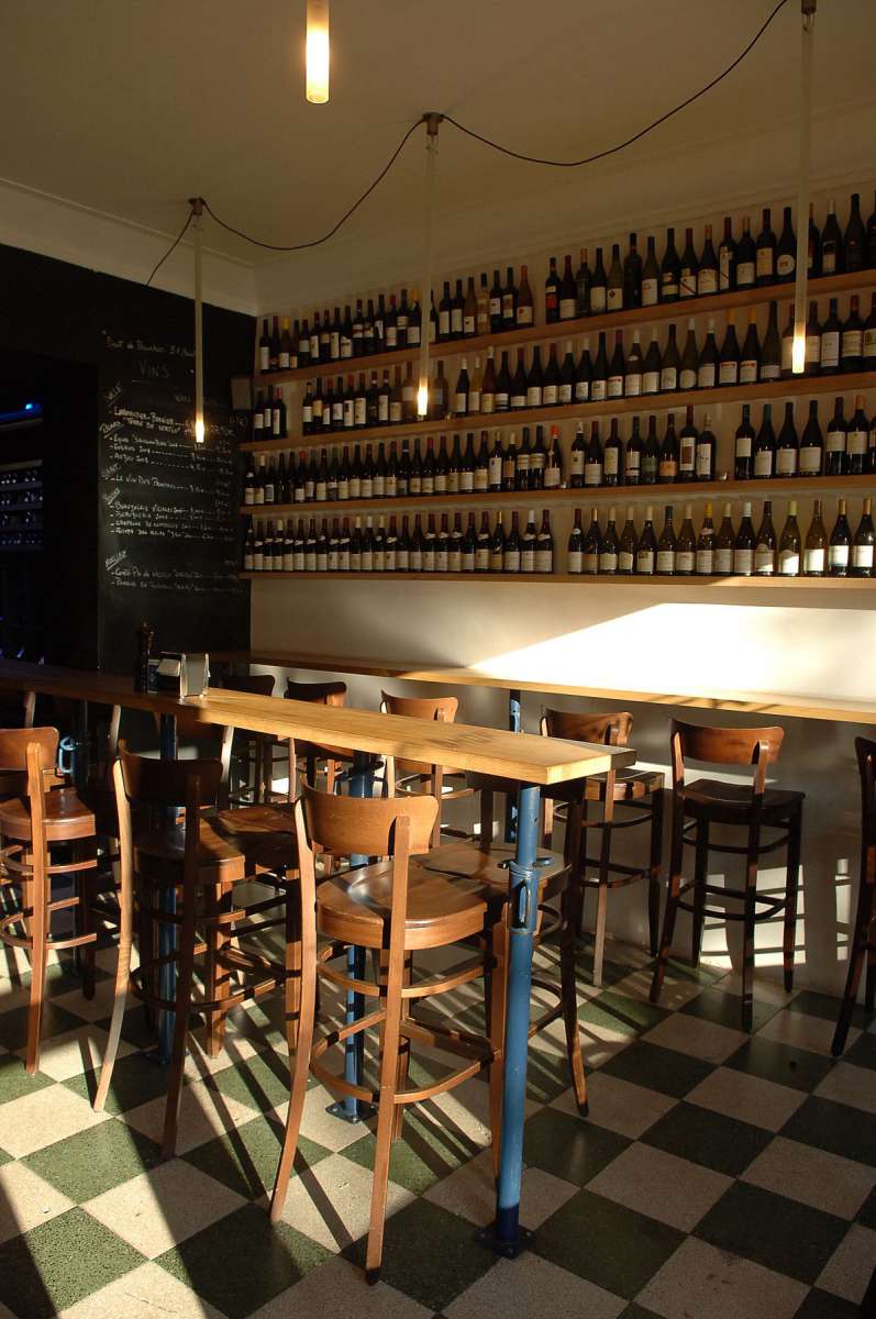 A tight budget and an original, stand-out concept was the order of the day. To achieve that wine cellar-feel, we painted the space black and lined the walls with shelves of glittering wine bottles – an Aladdin’s cave of burgundy beauty. The table legs, made from reclaimed height-adjustable ceiling props, which allowed people to sit at a table or prop up the bar, gave a rough and ready contrast. These ‘ingredients’ became the basis for a recipe that could be replicated in other districts of the city in need of a well-dressed drink.