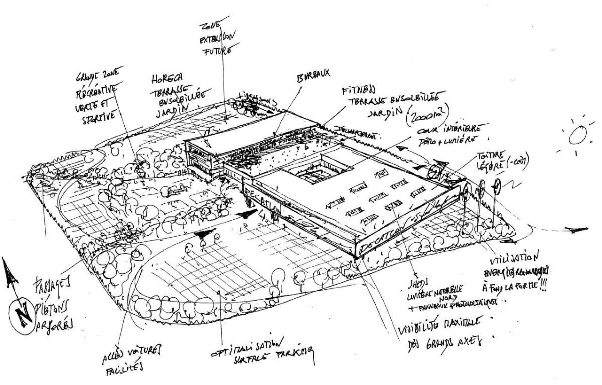 The developers and town planners both required Decathlon to share the space with other shops and activities so the initial drawings of the area were developed around public spaces and playing fields to create a social as well as commercial hub. Traffic impact assessments were crucial in order to avoid congestion in this very busy area and to provide easy access. The underground car parks open onto the sports pitches to allow in light, to ventilate it naturally and create a pleasant environment by inviting visitors to take part in these communal activities.