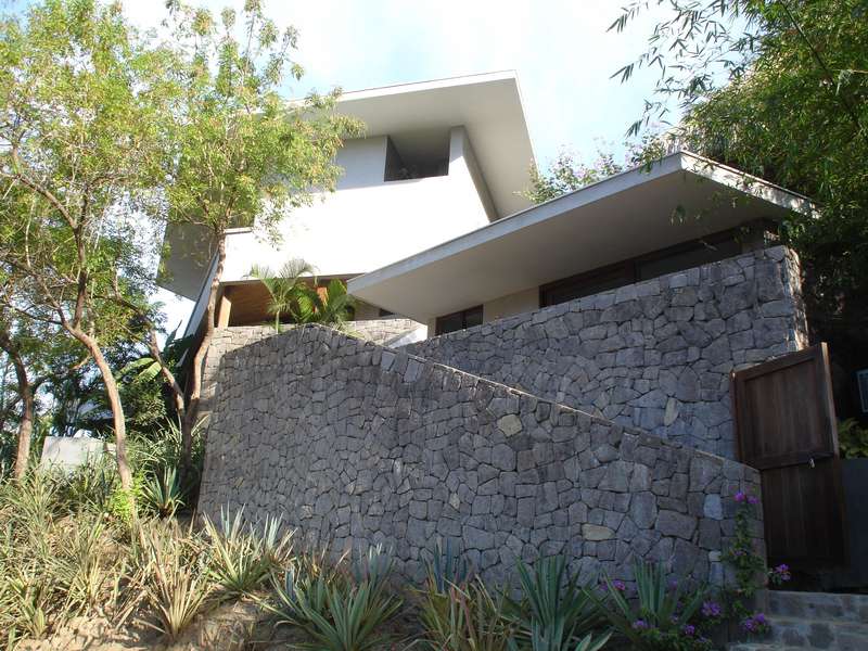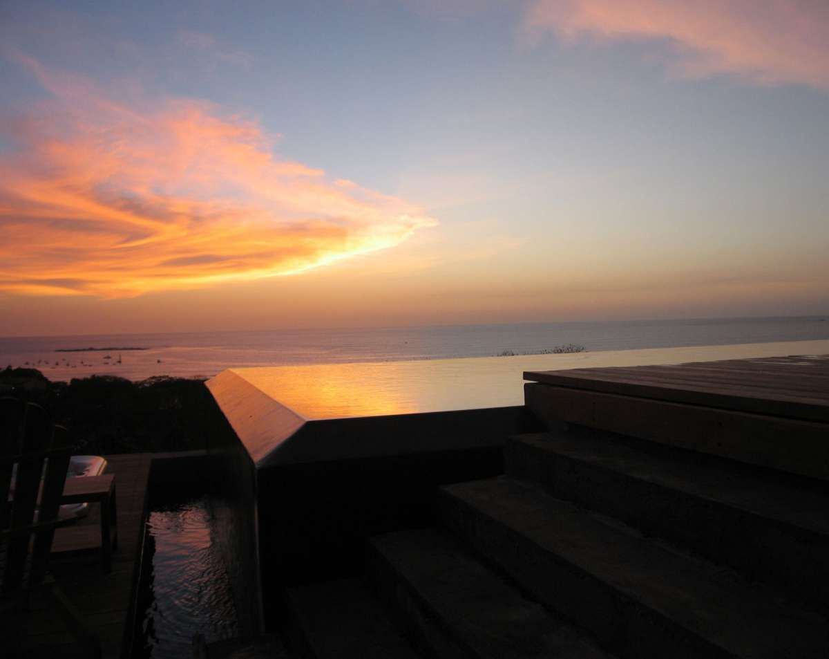 Belgium holds a unique place in her heart. It’s not just the people. Not even the Nordic-esque weather. Maybe it’s the distinct, but inclusive culture. Unlike him, she dislikes the heat, hates humidity, wilts when there’s too much sun and an influx of insects; all of which are omnipresent in Tamarindo. He is an accomplished surfer, used to travelling in remote tropical countries in search of the perfect break. She, on the other hand, prefers to read a book in an antiseptic environment; he is on a constant quest for adventure, for experiences that will stimulate his adrenaline. He loves nature. The house is located on a steep hill overlooking the city of Tamarindo, sat atop a plateau of 5 acres. The glistening Pacific twinkles below, just 15 minutes on foot. The Guard house and the Cook studio are carved into the hill side. The leftover earth was recycled to raise the garden level to the height of the terraces. The plateau intended for the building welcome the garden as all the constructions surround it at different levels following the contour lines of the site and cantilevering out over the cliff. The main living spaces are totally open plan, offering a view from the backyard on to the swimming pool that segues seamlessly with the ocean view. These open living spaces (that can be closed with concealed sliding windows) are in the middle of the two pillars of the house. The first internal pillar is the garden as an inner courtyard, bringing a freshness and intimacy to the whole project. The second one, this time external, is the pool terrace, allowing the experience of being at one with the sun, the sea, the sand and the salty pura vida air. These two distinct spaces are connected by large covered walkways giving shelter from sun and rain, abstracting the limits between the interior and the exterior. These circulation spaces bring us through the space along the walkway, travelling via the living spaces, to the bedrooms with their bathrooms open to the sky, and finally to the massage gazebo and its gigantic deck roof terraces where we drift and dream along the sunset.