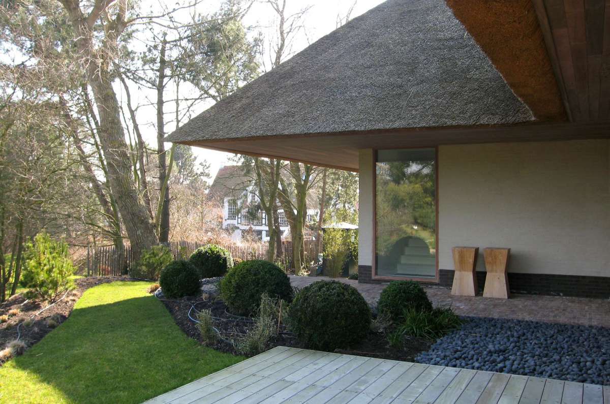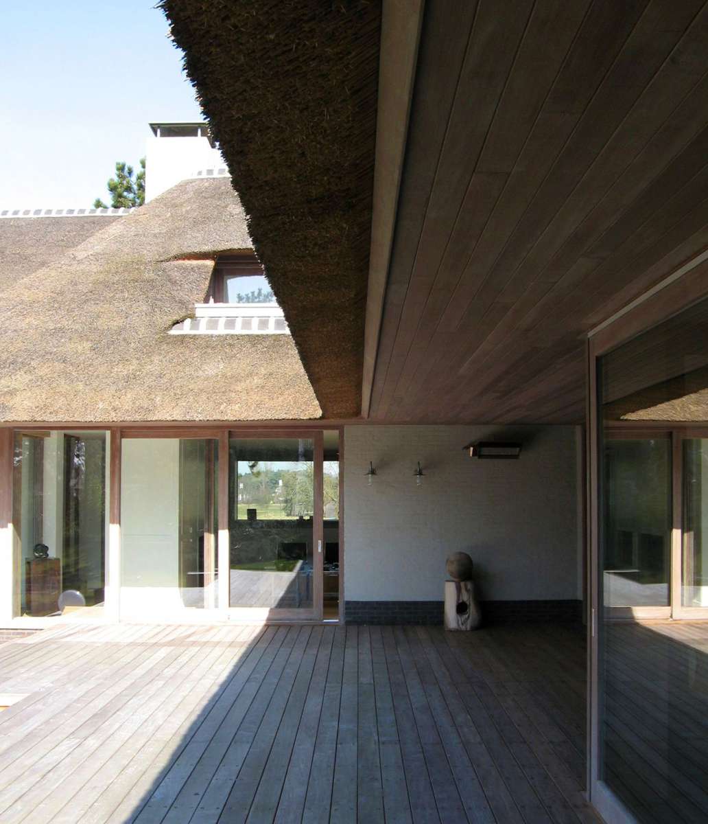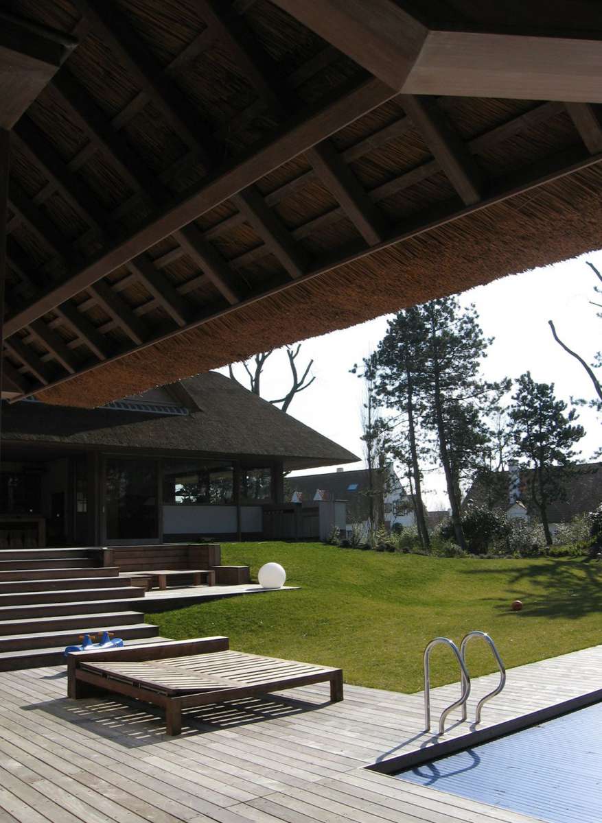 The villa is located alongside a golf course. While e had to meet stringent planning conditions and stick to a tight schedule, we were keen to integrate the villa into the landscape as much as possible and to preserve the natural views of this special environment. Our client had the intention to fitting and maximizing the project within the strict limits on volume that were permitted. This led us to develop a design that would make the most of the varied heights of the surrounding dunes, concealing the building among their multiple and complex slopes. Thatch is a natural material typical of the region that is also widely used in many parts of the world. Its malleability enabled us to create a unique style that blends perfectly with our northern maritime environment while bringing an aesthetic that is close to the large covered terraces and overhanging roofs found in architectural styles associated with the Far East. This surprising approach unexpectedly connected with our clients’ dreams, who love Bali but did not dare dream of bringing it to the Belgian Coast. This unstated dual identity gives the owners the feeling of being simultaneously at home and elsewhere, giving the building a timeless quality.