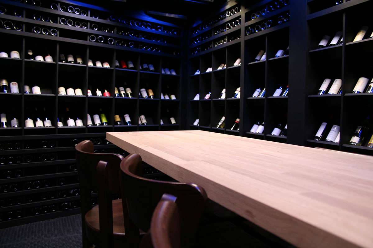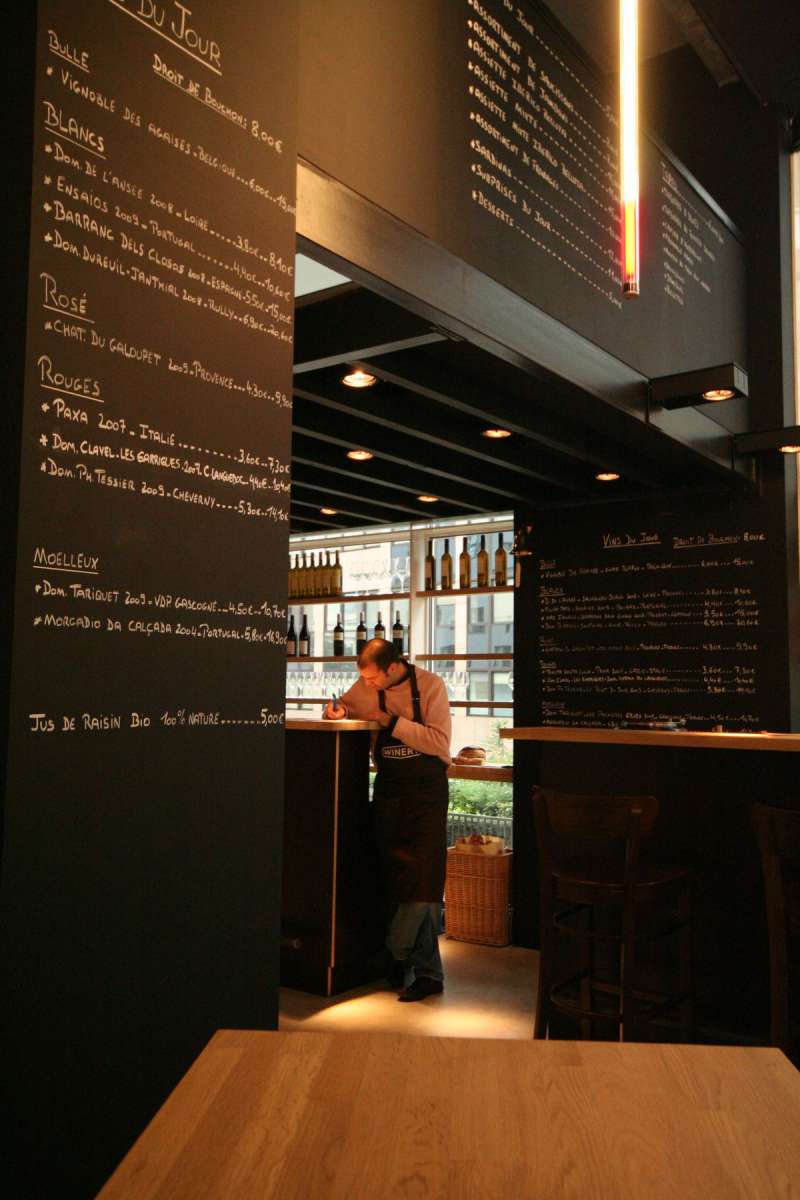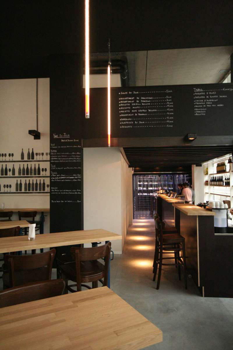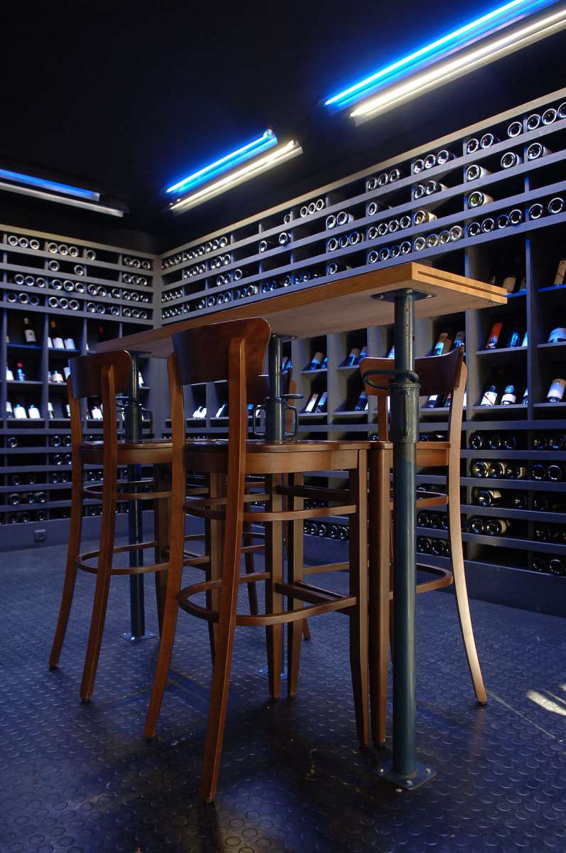 A tight budget and an original, stand-out concept was the order of the day. To achieve that wine cellar-feel, we painted the space black and lined the walls with shelves of glittering wine bottles – an Aladdin’s cave of burgundy beauty. The table legs, made from reclaimed height-adjustable ceiling props, which allowed people to sit at a table or prop up the bar, gave a rough and ready contrast. These ‘ingredients’ became the basis for a recipe that could be replicated in other districts of the city in need of a well-dressed drink.